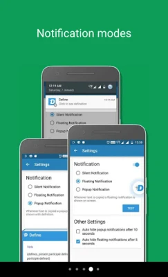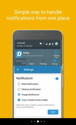 » Silence Notification: Shown on notification panel on copying word clicking on notification to redirect for full definition screen.