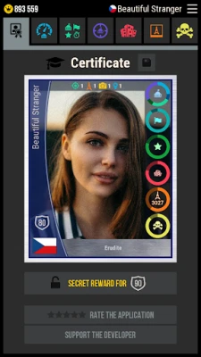 The app displays a Certificate of Knowledge, which shows the level of your knowledge and gaming achievements.